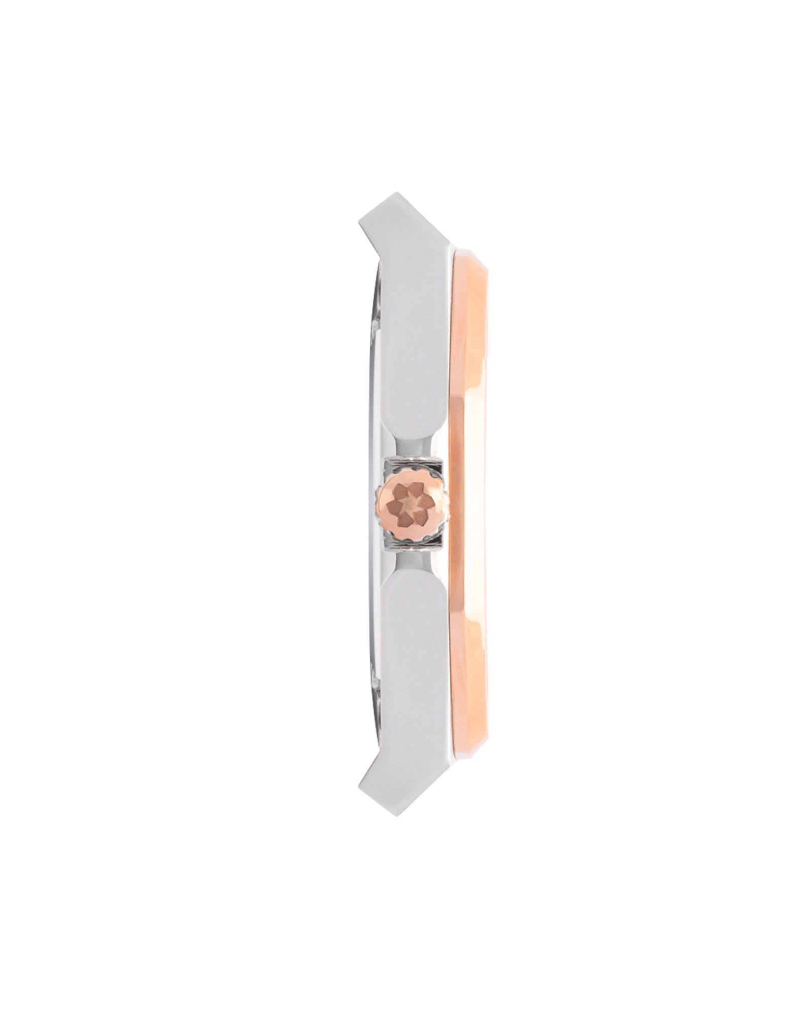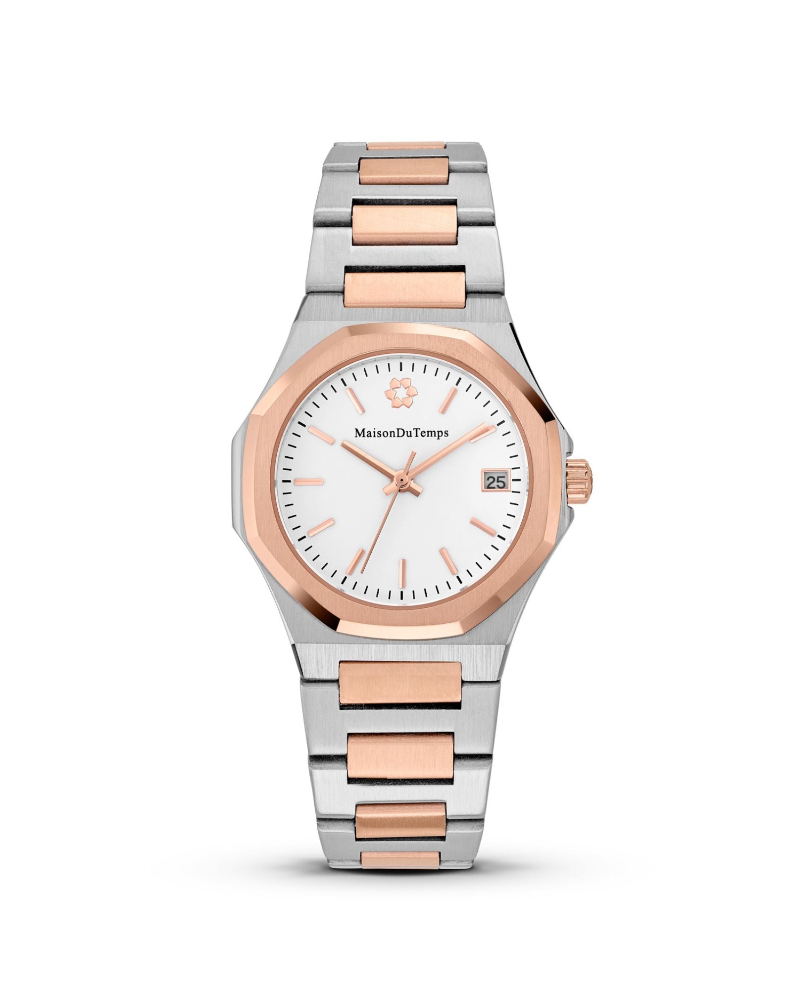 Montre quartz MTGamma Femme de MaisonDuTemps : Boîtier en acier 316L de 34 mm, équipé du mécanisme Miyota quartz. Détails dorés rose, lunette octogonale, verre saphir, et finitions satinée et polie. Étanche jusqu’à 50 mètres.
